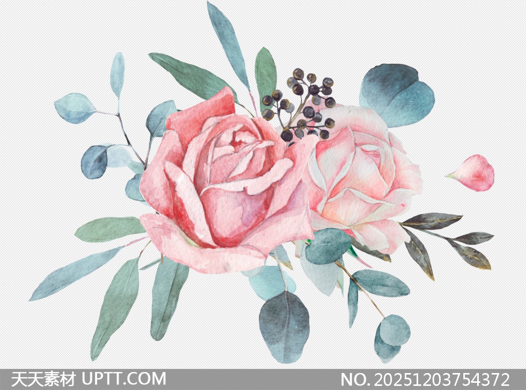 这款水彩风格的花卉装饰素材以柔美粉色玫瑰为核心,搭配青绿色尤加利叶与深色浆果点缀,笔触自然晕染,营造出清新雅致的艺术氛围,适用于婚礼请柬、生日贺卡、PPT封面、社交媒体配图及手账装饰等场景,为各类设计增添浪漫温柔的视觉温度,是提升女性化、文艺感画面质感的理想装饰元素。【 素材唯一编号 20251203754372 】,插画类红色风格PNG格式素材下载,文件格式为.PNG,下载完成后的文件为一个压缩包,素材压缩包大小8.44 MB,请解压后用相应软件打开。