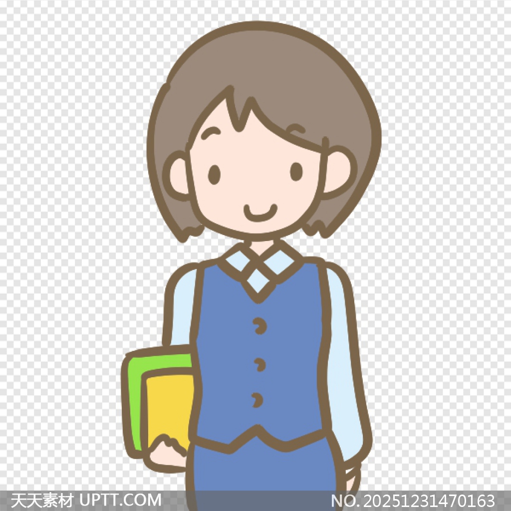 这幅手绘插画以简洁温暖的线条勾勒出一位亲切的职业女性教师形象,身着蓝色马甲搭配浅蓝衬衫,怀抱彩色书籍,面带微笑传递专业与亲和力,透明背景设计便于自由融入各类设计场景,是教育主题PPT、宣传海报、课程封面及校园活动视觉的理想素材,轻松提升画面人文温度与职业辨识度。【 素材唯一编号 20251231470163 】,卡通类蓝色风格PNG格式素材下载,文件格式为.PNG,下载完成后的文件为一个压缩包,素材压缩包大小55.95 KB,请解压后用相应软件打开。