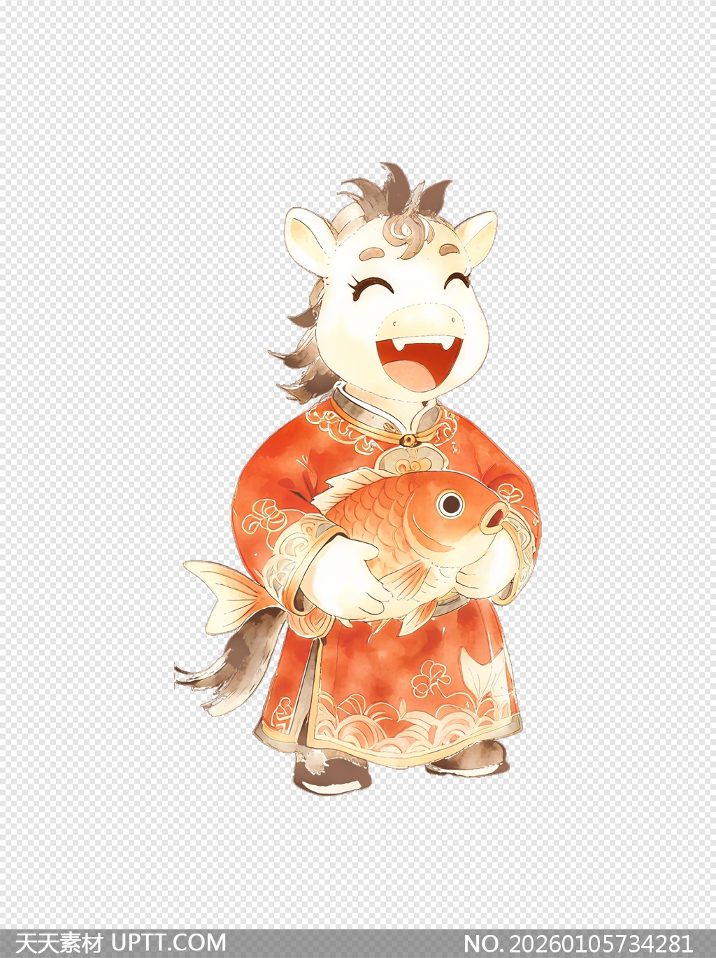 这款水彩风格的卡通小马插画身着喜庆红袍,怀抱金鱼笑容灿烂,完美融合生肖马与“年年有余”的吉祥寓意,采用免抠透明背景设计,方便直接拖入PPT、海报或节日贺卡中使用,是春节主题宣传、儿童教育课件及文创产品设计的理想素材,轻松为你的视觉内容增添童趣与传统年味。【 素材唯一编号 20260105734281 】,卡通类红色风格PSD格式素材下载,文件格式为.PSD,下载完成后的文件为一个压缩包,素材压缩包大小45.12 MB,请解压后用相应软件打开。