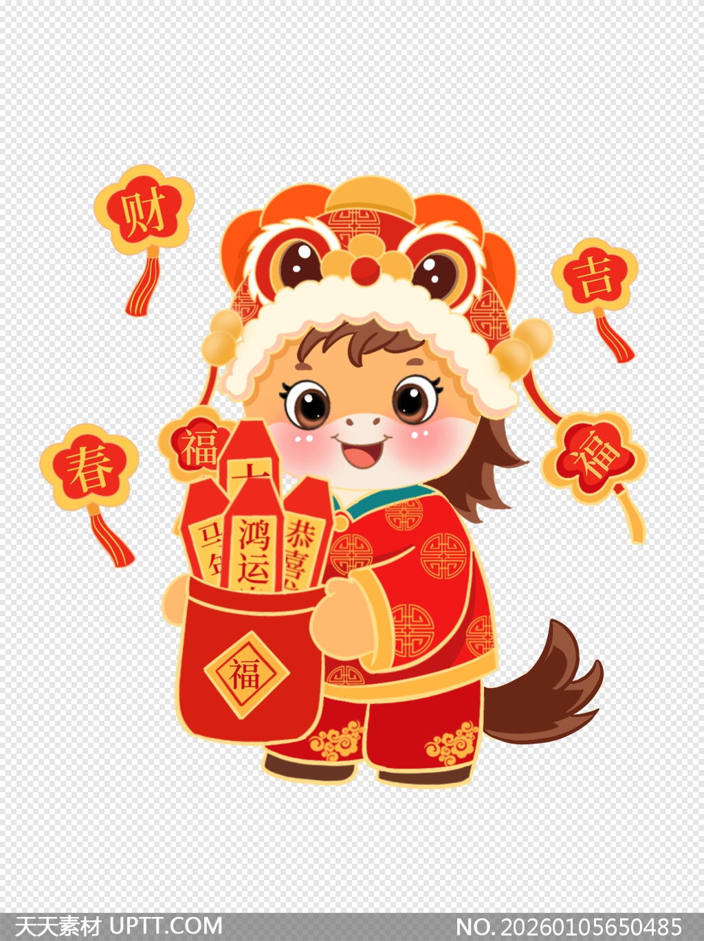 这款马年主题卡通福娃插画以萌趣造型和喜庆配色为核心,身着传统纹样红装、头戴狮帽怀抱满载“鸿运”“恭喜”字样的红包,四周环绕“春”“福”“财”“吉”吉祥挂饰,完美融合生肖文化与新年祝福;免抠透明背景设计便于直接嵌入节日海报、贺卡、PPT及电商Banner等场景,是打造浓厚节庆氛围的高适配视觉素材。【 素材唯一编号 20260105650485 】,喜庆类红色风格PSD格式素材下载,文件格式为.PSD,下载完成后的文件为一个压缩包,素材压缩包大小10.28 MB,请解压后用相应软件打开。