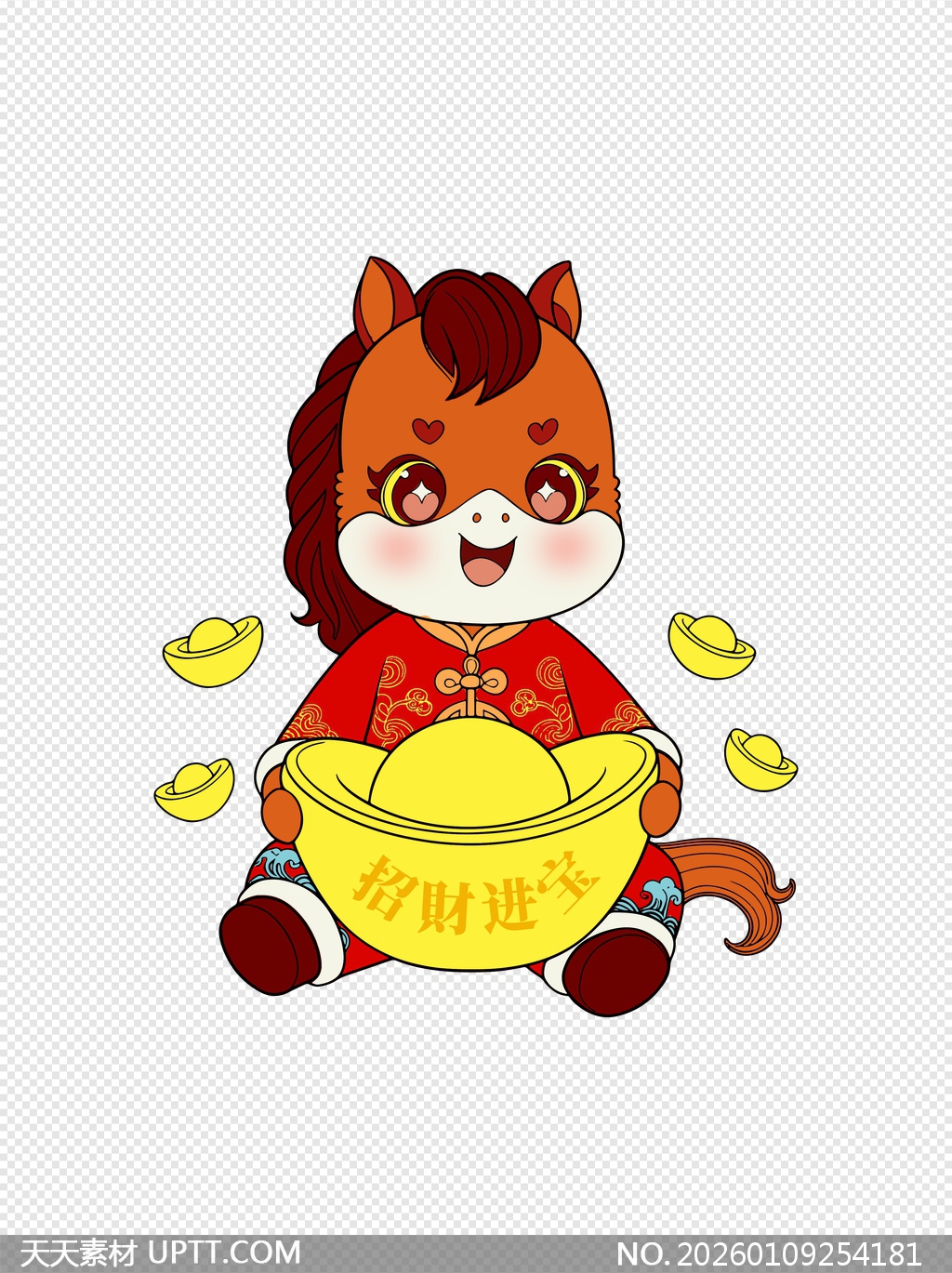这款Q版马年吉祥物插画以萌趣可爱的卡通形象呈现,身着喜庆红衣怀抱刻有“招财进宝”的巨型金元宝,周身环绕飞舞小金锭,完美融合生肖文化与财富寓意,透明背景免抠设计适配各类场景,是春节海报、电商促销、贺卡设计及社交媒体运营中营造节日氛围、传递好运祝福的绝佳视觉元素。【 素材唯一编号 20260109254181 】,卡通类红色风格PSD格式素材下载,文件格式为.PSD,下载完成后的文件为一个压缩包,素材压缩包大小1.97 MB,请解压后用相应软件打开。