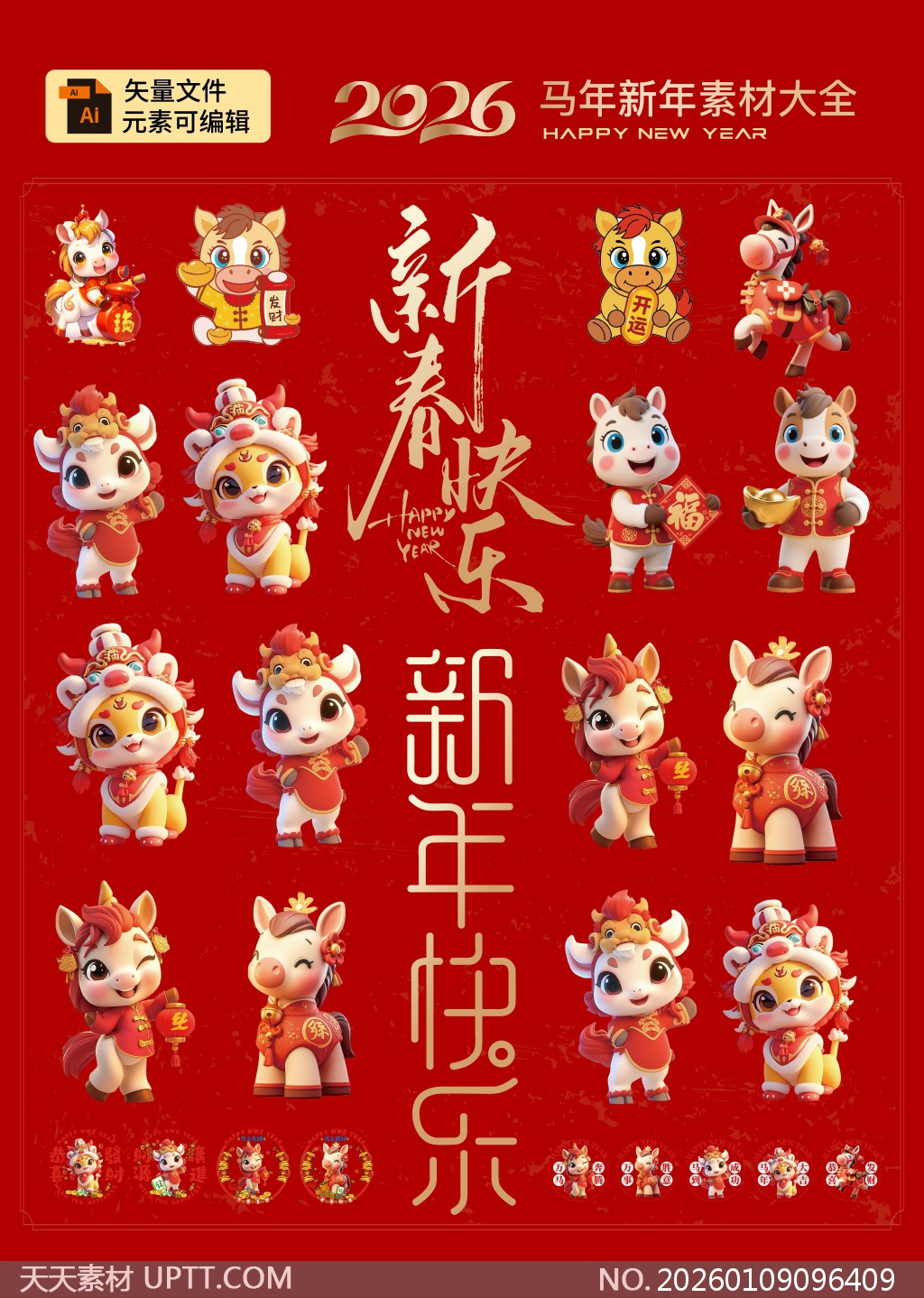 本套2026马年新春卡通形象素材以Q萌3D风格呈现,多款小马角色身着传统年服、手持福字红包、金元宝与灯笼等吉祥物,表情生动喜庆,完美融合生肖文化与现代审美;适用于春节海报、贺卡、H5页面、社交媒体配图及品牌节日营销活动,AI矢量格式支持自由编辑,是打造节庆视觉内容的理想设计资源。【 素材唯一编号 20260109096409 】,喜庆类红色风格AI格式素材下载,文件格式为.AI,下载完成后的文件为一个压缩包,素材压缩包大小39.13 MB,请解压后用相应软件打开。
