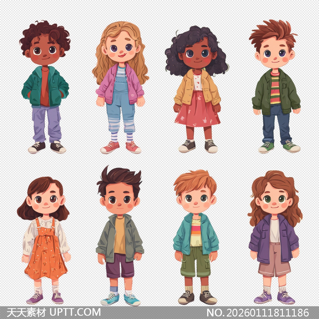 这组Q版儿童角色插画以柔和水彩笔触与鲜明色彩呈现,八位不同肤色、发型与穿搭的萌趣孩子形象生动可爱,表情自然富有亲和力,支持透明背景免抠直接使用,完美适配儿童教育课件、绘本封面、品牌IP设计、节日贺卡及社交媒体视觉内容,为您的创意项目注入童真活力与多元包容感。【 素材唯一编号 20260111811186 】,卡通类彩色风格PNG格式素材下载,文件格式为.PNG,下载完成后的文件为一个压缩包,素材压缩包大小5.95 MB,请解压后用相应软件打开。