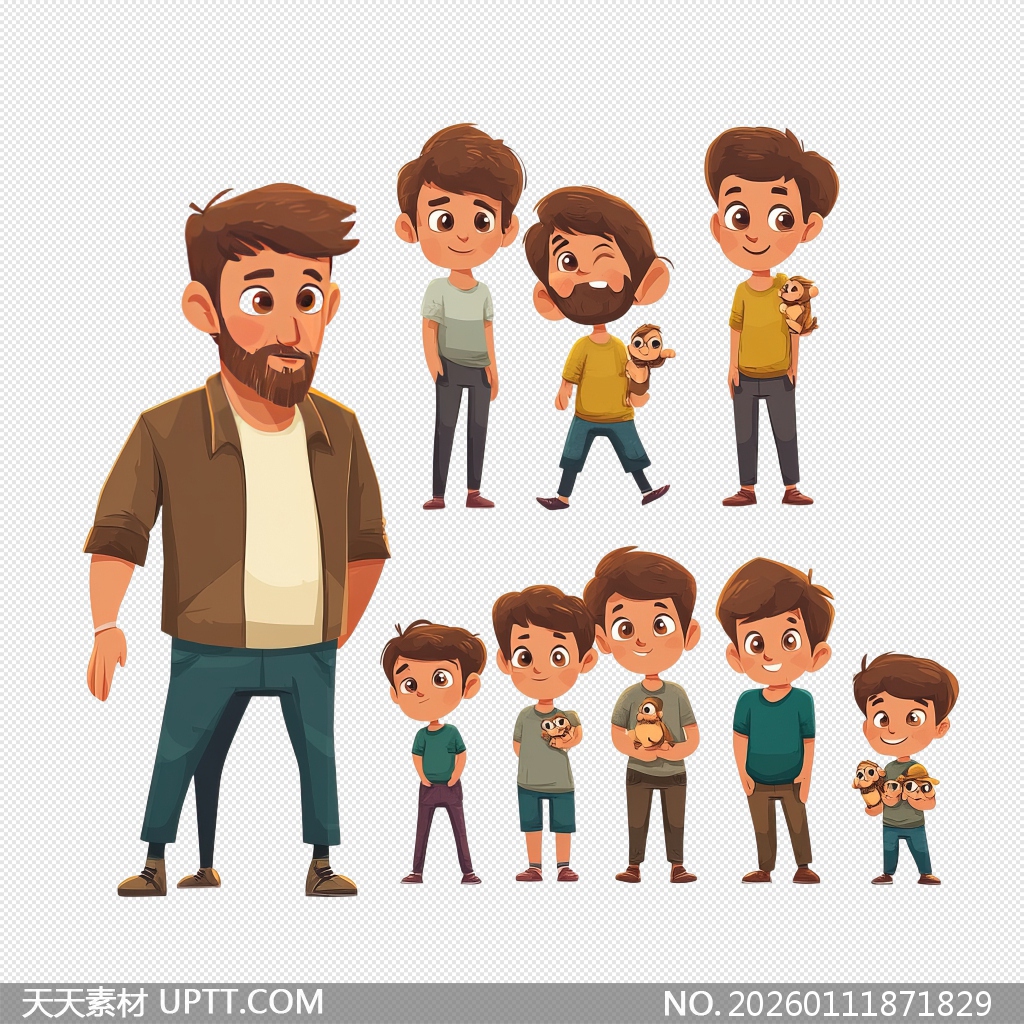 这组温馨可爱的卡通父子插画以手绘风格呈现,包含一位慈祥父亲与多个造型各异的萌娃角色,表情生动、动作丰富,完美适配亲子主题设计;免抠PNG格式便于直接拖入PPT、海报、儿童教育课件或社交媒体宣传图中,轻松打造有温度的家庭场景,是节日贺卡、育儿品牌视觉及儿童活动物料的理想素材。【 素材唯一编号 20260111871829 】,卡通类黄色风格PNG格式素材下载,文件格式为.PNG,下载完成后的文件为一个压缩包,素材压缩包大小2.46 MB,请解压后用相应软件打开。