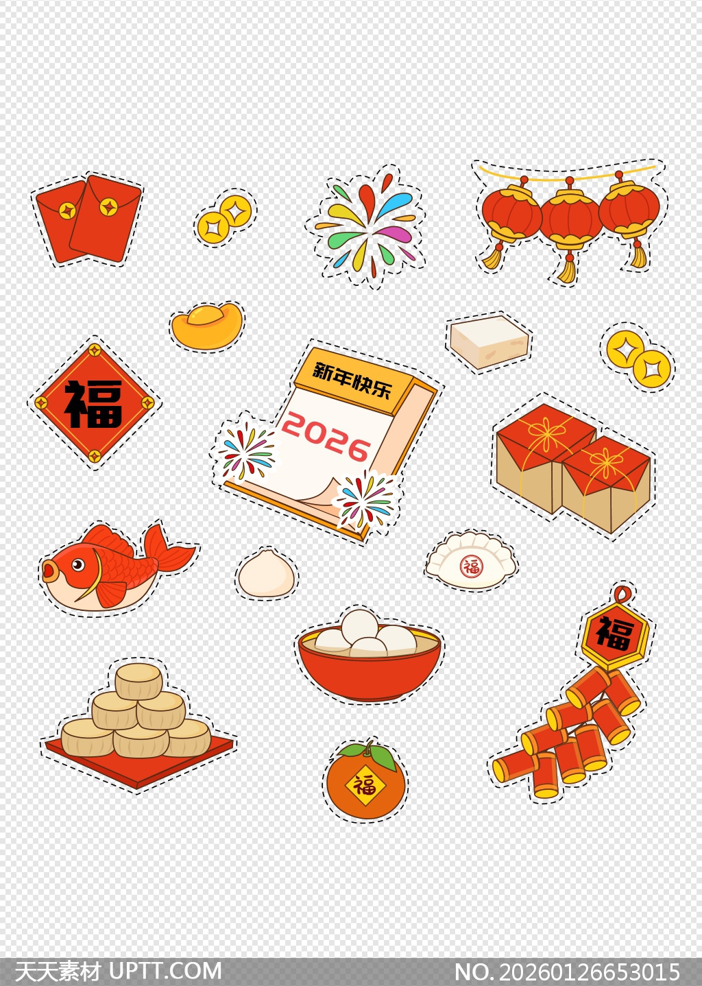 本套2026春节主题素材以清新手绘风格呈现红包、灯笼、鞭炮、福字、金鱼、年糕、汤圆等经典年俗元素,采用统一虚线裁剪边框设计,适配贴纸、插画与UI装饰需求;色彩明快喜庆,构图简洁饱满,既保留传统吉祥寓意又兼具现代审美,适用于新年贺卡、社交媒体海报、电商Banner、PPT节日模板及文创产品设计,轻松营造浓厚节庆氛围,助力用户高效打造富有文化温度的视觉内容。【 素材唯一编号 20260126653015 】,喜庆类红色风格AI格式素材下载,文件格式为.AI,下载完成后的文件为一个压缩包,素材压缩包大小1.03 MB,请解压后用相应软件打开。