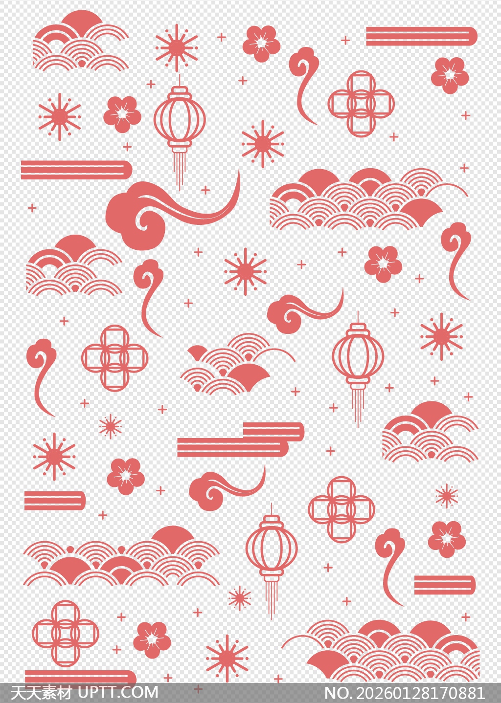 祥云 浪花 灯笼 梅花 如意纹样 传统节庆 红色装饰 节日元素 吉祥图案