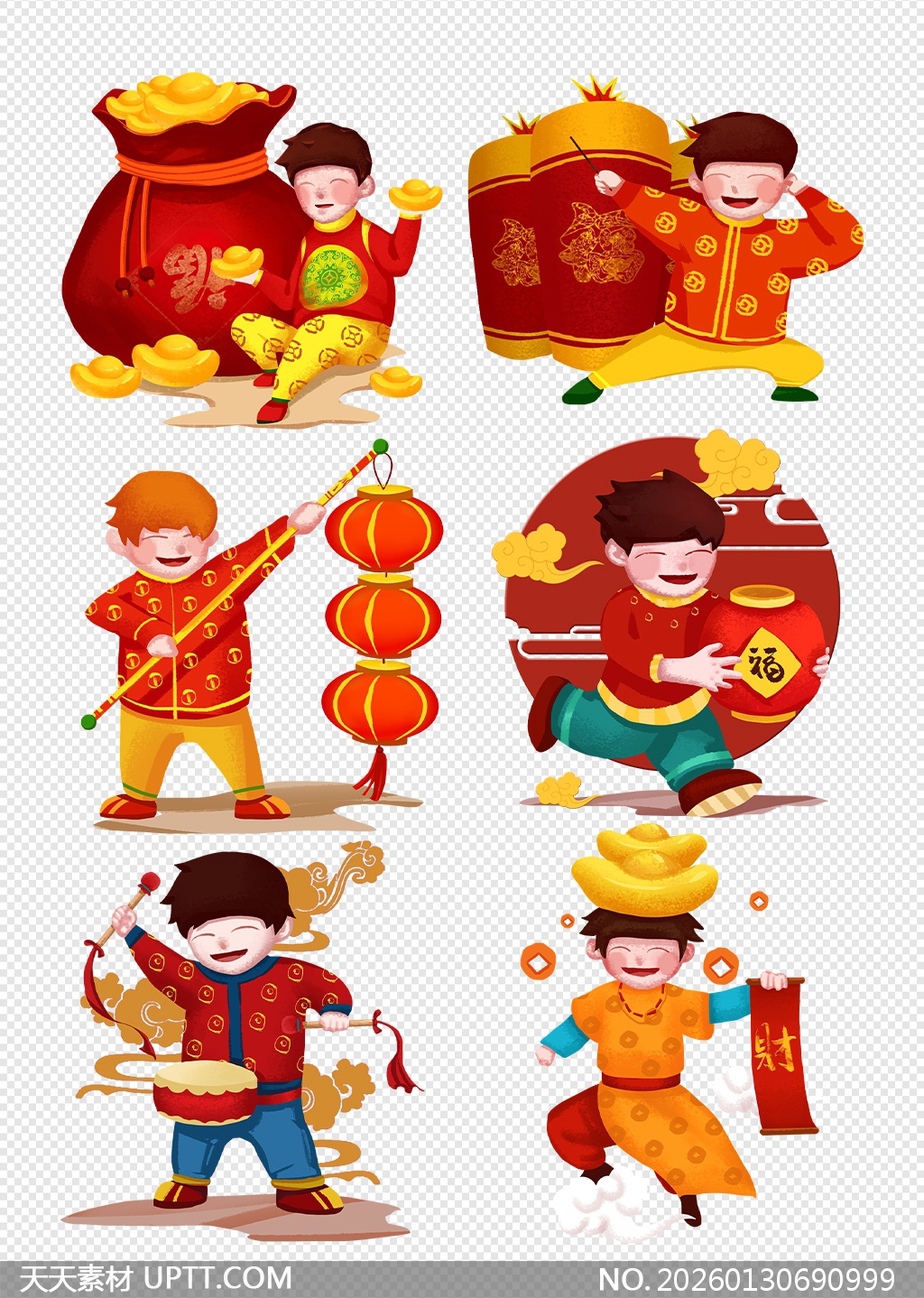 本组免抠素材以喜庆中国风为主题,精选六款生动童趣的春节场景插画,包含手持金元宝的福袋童子、舞动鞭炮的欢腾少年、高挂红灯笼的迎新孩童、怀抱“福”字酒坛的奔跑娃娃、敲鼓祈福的小勇士及头顶金元宝挥春联的吉祥使者,人物造型圆润可爱、色彩浓郁热烈,细节融入传统纹样与祥云元素,适用于新年海报、贺卡设计、H5页面装饰、社交媒体配图及线下活动展陈等多元场景,助力快速打造浓厚节庆氛围。【 素材唯一编号 20260130690999 】,喜庆类红色风格PSD格式素材下载,文件格式为.PSD,下载完成后的文件为一个压缩包,素材压缩包大小20.96 MB,请解压后用相应软件打开。