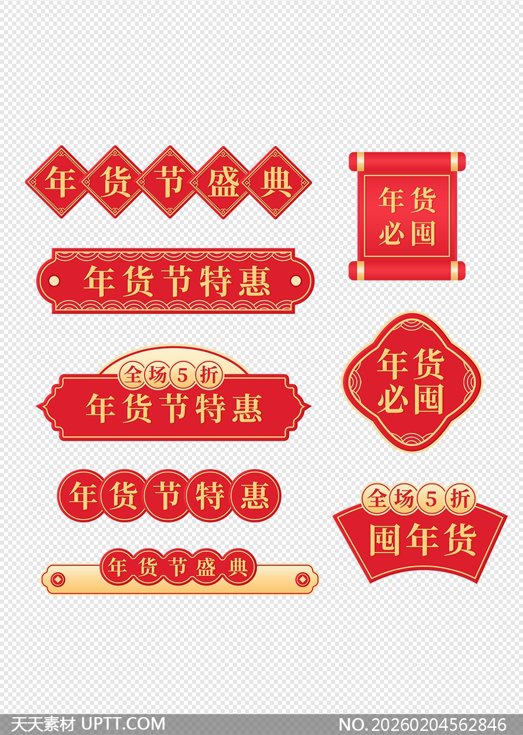 本组素材包含菱形拼接、卷轴、云纹边框、圆形徽章等多种中式风格促销标签与装饰元素,采用喜庆红金配色搭配传统纹样,突出“年货节特惠”“全场5折”“年货必囤”等核心信息,设计精致且富有节日氛围;所有元素均为透明背景免抠图,可灵活用于电商首页Banner、商品主图角标、社交媒体海报、线下展陈布置及PPT节日专题页等场景,快速提升视觉吸引力与促销转化效果。【 素材唯一编号 20260204562846 】,喜庆类红色风格PSD格式素材下载,文件格式为.PSD,下载完成后的文件为一个压缩包,素材压缩包大小47.07 MB,请解压后用相应软件打开。
