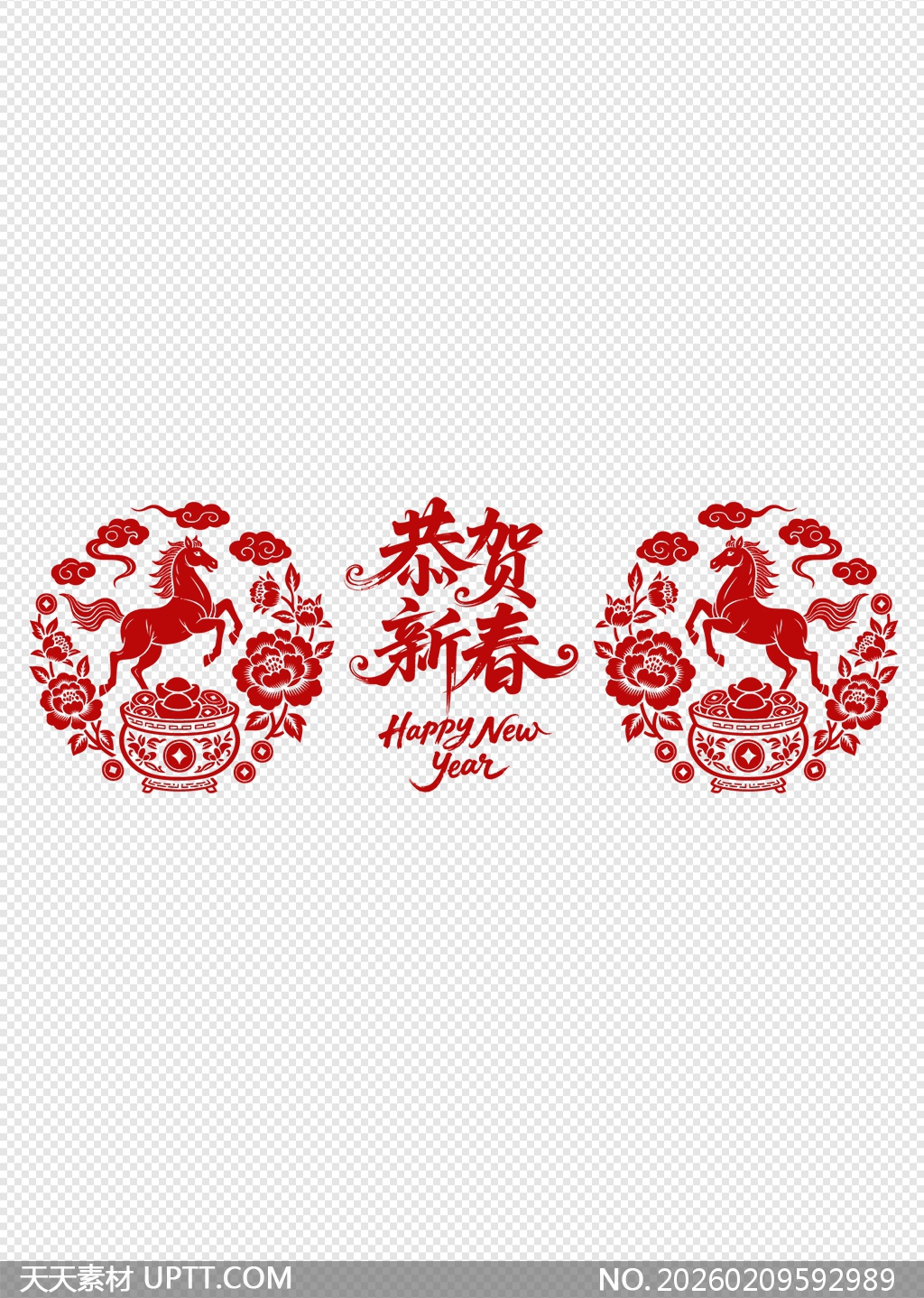 本作品以传统剪纸艺术为灵感,采用鲜明红色调呈现腾跃骏马、祥云、牡丹与聚宝盆等吉祥元素,寓意马年纳福、财源广进;中央“恭贺新春”书法字体遒劲洒脱,辅以英文“Happy New Year”增强国际感;整体构图对称饱满,细节精致,透明底设计便于灵活贴附于玻璃窗、门扉、礼盒或电子屏幕,适用于春节装饰、年货包装、品牌节日营销及新媒体贺卡制作,兼具文化韵味与现代实用价值。【 素材唯一编号 20260209592989 】,剪纸类红色风格AI格式素材下载,文件格式为.AI,下载完成后的文件为一个压缩包,素材压缩包大小1005.54 KB,请解压后用相应软件打开。