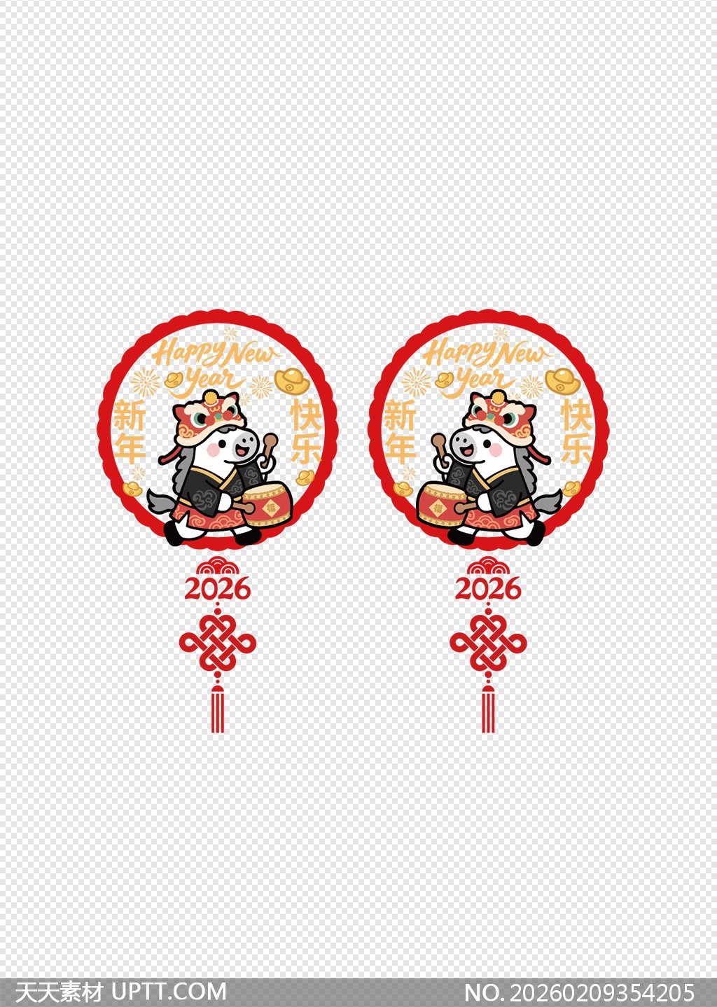 本作品以2026丙午马年为主题,采用Q版萌趣马形象搭配传统狮头帽与鼓乐元素,融合“新年快乐”中英文字样、金元宝、烟花及中国结流苏等吉祥符号,整体构图圆润饱满,红金配色喜庆热烈;透明底设计便于灵活贴附于礼盒、窗花、贺卡或电子贺图中,适用于春节装饰、文创产品包装、社交媒体拜年素材及节日活动物料制作,兼具传统文化韵味与现代审美趣味,轻松传递新春祝福与祥瑞寓意。【 素材唯一编号 20260209354205 】,喜庆类红色风格AI格式素材下载,文件格式为.AI,下载完成后的文件为一个压缩包,素材压缩包大小1.95 MB,请解压后用相应软件打开。