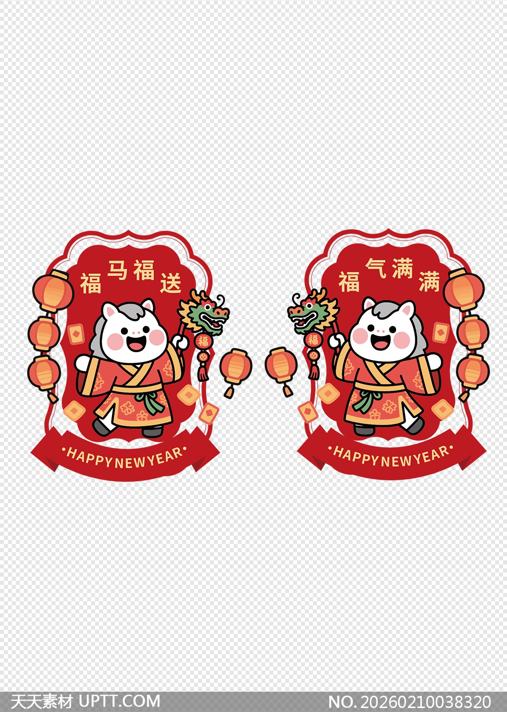 本款2026新年透明贴纸以萌趣福马为主角,身着传统红金汉服,手持龙形祥瑞与“福”字挂饰,搭配灯笼、铜钱等吉祥元素,整体采用喜庆红底与通透边框设计,视觉层次丰富且不失轻盈感;两款分别题写“福马送福”“福气满满”,寓意吉祥圆满;适用于春节礼盒封口、贺卡装饰、窗花点缀、手机壳DIY及电商包装等场景,既传承年俗文化又契合现代审美,为新年增添童趣与仪式感。【 素材唯一编号 20260210038320 】,喜庆类红色风格AI格式素材下载,文件格式为.AI,下载完成后的文件为一个压缩包,素材压缩包大小2.13 MB,请解压后用相应软件打开。
