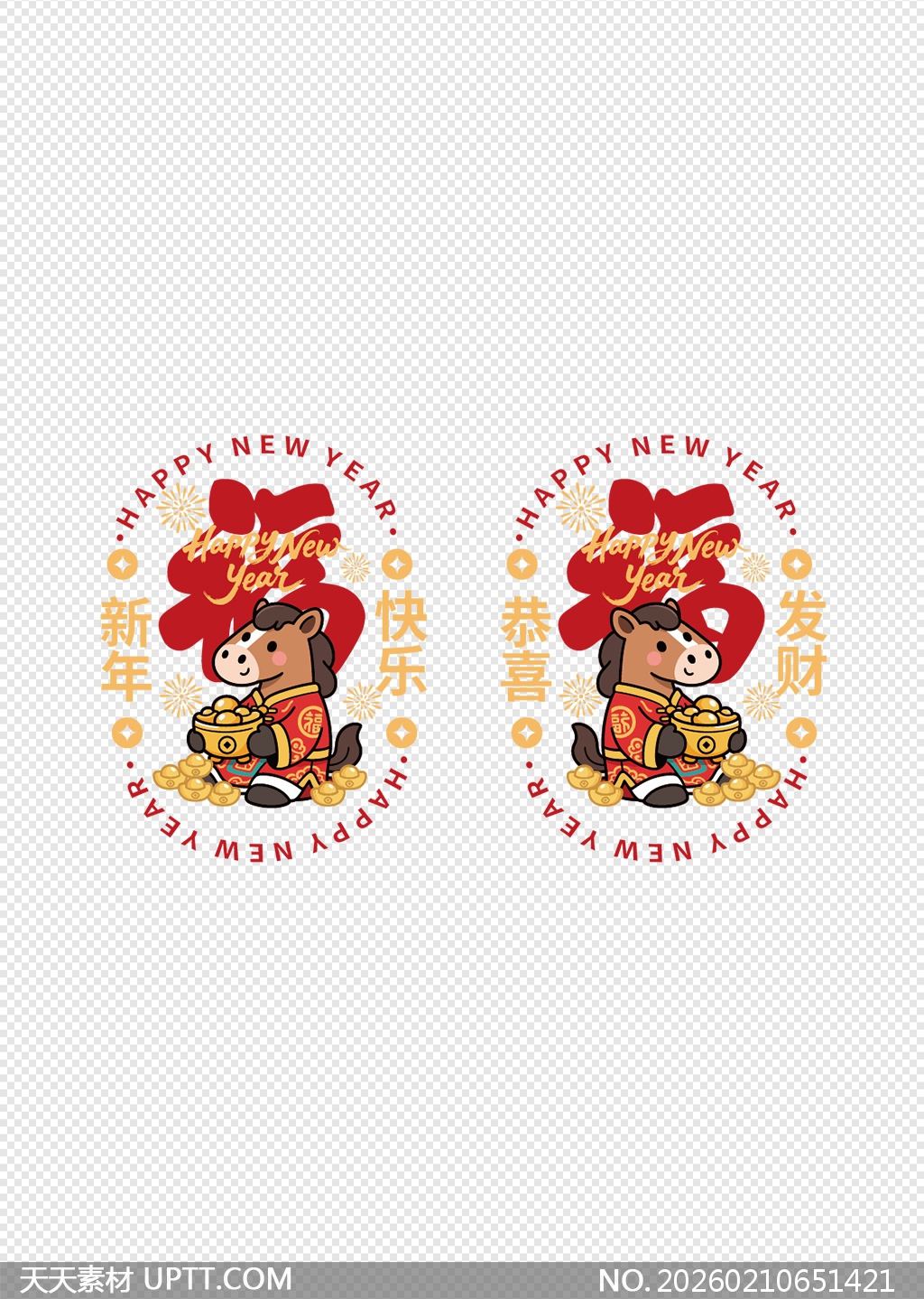 本作品以2026丙午马年为主题,采用喜庆红金配色,融合传统“福”字、萌趣骏马与金元宝元素,马儿身着中式祥云纹服饰怀抱聚宝盆,寓意福运临门、财源广进;圆形构图搭配英文“Happy New Year”与中文吉祥语(如“新年快乐”“恭喜发财”),中西结合又不失年味;透明底设计适配多种载体,可用于门窗玻璃、礼盒包装、手机壳、贺卡或电子贺图装饰,轻松营造节日氛围,是春节布置、文创产品及数字设计的理想素材。【 素材唯一编号 20260210651421 】,喜庆类红色风格AI格式素材下载,文件格式为.AI,下载完成后的文件为一个压缩包,素材压缩包大小2.08 MB,请解压后用相应软件打开。