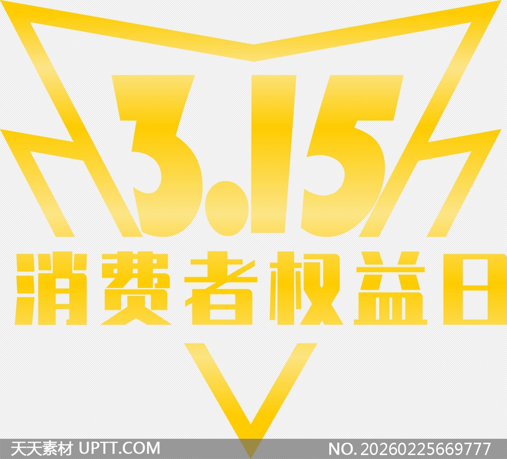 该图形元素以醒目的金色渐变呈现,巧妙融合盾牌的守护意象与闪电的迅捷力量,中央“3.15”数字粗犷有力、富有视觉冲击力,下方“消费者权益日”字样稳重清晰,整体构图对称均衡、层次分明,兼具权威感与现代设计感;适用于3·15主题海报、公益宣传展板、政府及企业官网横幅、社交媒体推文配图及PPT汇报封面等场景,能快速传递维权保障的核心理念,提升传播辨识度与公众信任感。【 素材唯一编号 20260225669777 】,简约类黄色风格PNG格式素材下载,文件格式为.PNG,下载完成后的文件为一个压缩包,素材压缩包大小191.79 KB,请解压后用相应软件打开。