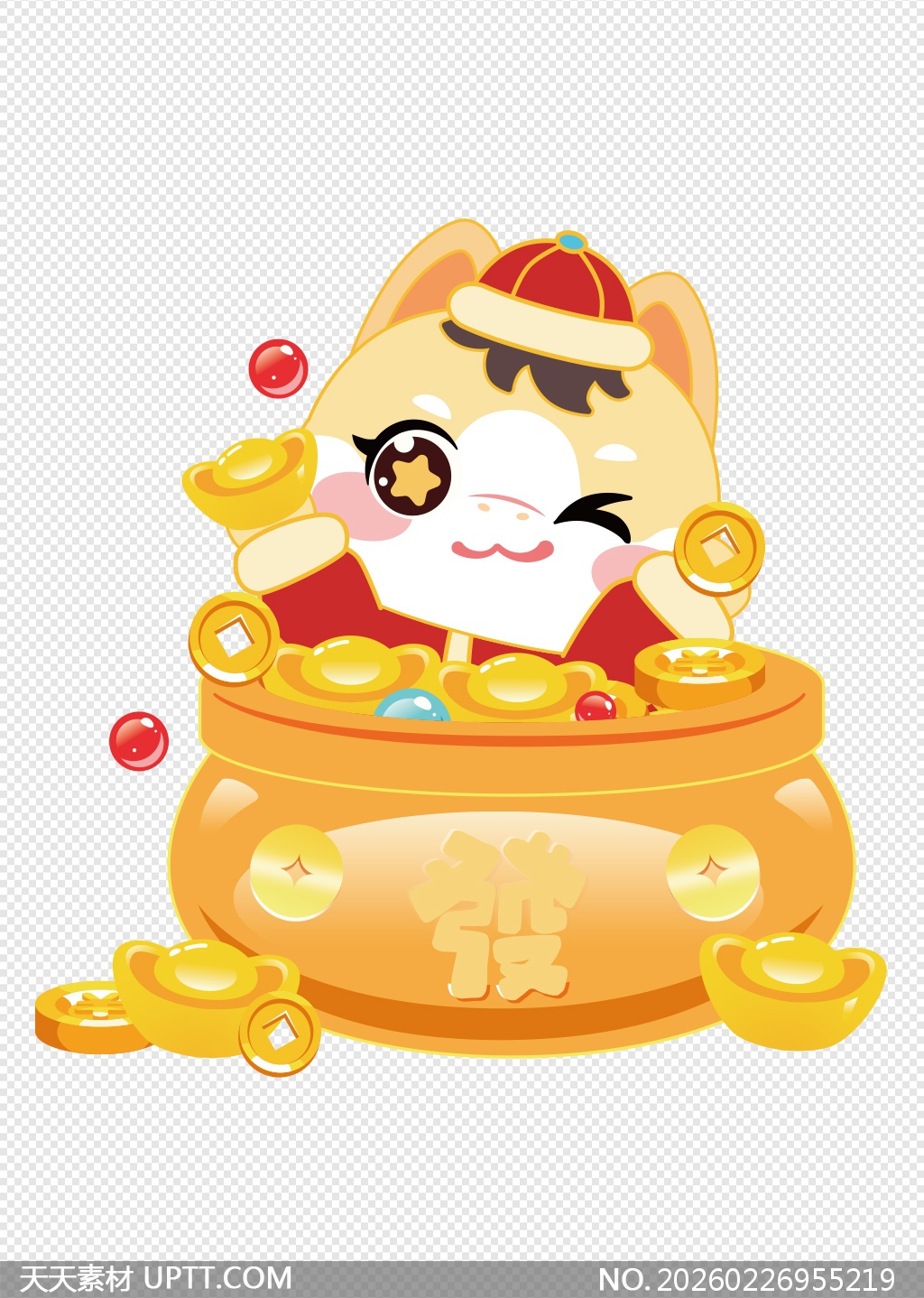 该作品以可爱萌趣的卡通马形象为核心,身着喜庆红袍、头戴传统帽饰,俏皮眨眼间怀抱满溢金元宝的聚宝盆,盆身镌刻“發”字并点缀祥云纹样,辅以飞溅的铜钱与红珠增强动感与吉祥寓意;整体采用明亮暖色调与扁平化矢量风格,线条圆润饱满,细节精致富有节日氛围,适用于春节贺卡、电商促销海报、红包封面、年会PPT背景及文创产品设计等场景,传递招财纳福、兴旺如意的美好祝愿。【 素材唯一编号 20260226955219 】,喜庆类黄色风格AI格式素材下载,文件格式为.AI,下载完成后的文件为一个压缩包,素材压缩包大小1.69 MB,请解压后用相应软件打开。