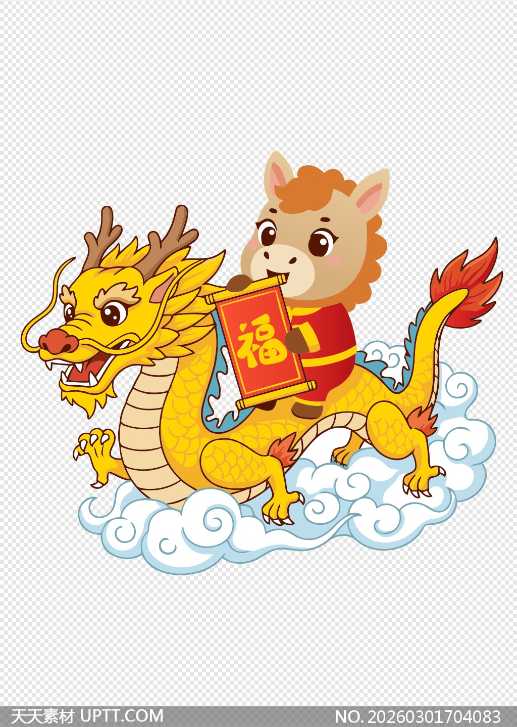 该作品以喜庆祥瑞的国风插画风格呈现,卡通小马身着红金传统服饰,骑乘威武金龙翱翔于如意云纹之上,手持“福”字卷轴寓意纳福迎祥;整体色彩明快饱满,线条圆润可爱,融合传统龙纹、云纹与吉祥符号,兼具童趣与文化韵味,适用于春节贺卡、年俗海报、节庆PPT背景、文创产品设计及儿童教育素材等场景,传递新春祝福与生肖马年的蓬勃活力。【 素材唯一编号 20260301704083 】,喜庆类黄色风格AI格式素材下载,文件格式为.AI,下载完成后的文件为一个压缩包,素材压缩包大小855.78 KB,请解压后用相应软件打开。