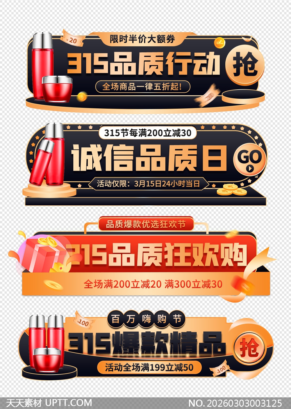 本组横幅素材以黑金与橙红为主色调,融合3D质感化妆品、金币、礼盒等立体元素,突出“品质”“诚信”“狂欢购”核心信息,采用醒目渐变字体与动态飘带设计增强视觉冲击力;四款风格各异的横幅分别适配限时大额券、满减促销、爆款精选及节日专场等场景,适用于电商首页Banner、APP开屏广告、社交媒体推广及线下门店导视系统,兼顾专业感与促销氛围,助力品牌在315期间高效传递品质承诺并提升转化率。【 素材唯一编号 20260303003125 】,喜庆类黑白灰风格PSD格式素材下载,文件格式为.PSD,下载完成后的文件为一个压缩包,素材压缩包大小2.3 MB,请解压后用相应软件打开。